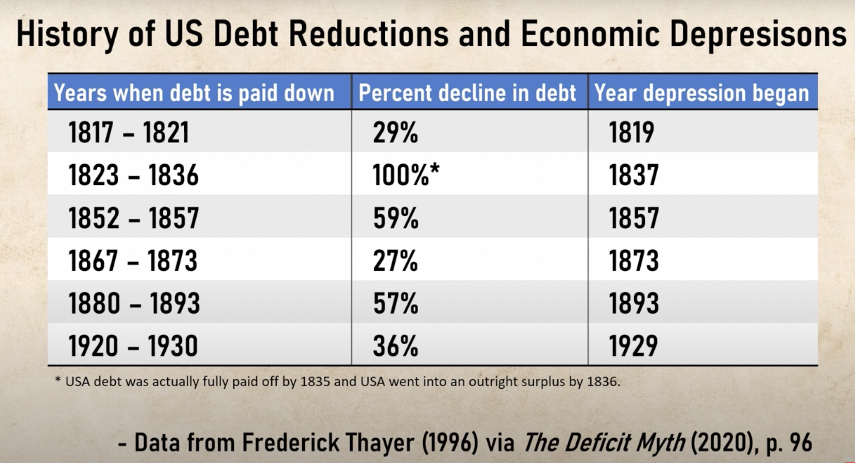 Stephanie Kelton, a leading MMT proponent, relies on historical US evidence in her book The Deficit Myth. Citing the work of Frederick Thayer, she argues that six periods of significant government debt reduction were all followed by a crash. On a YouTube video I found someone who had produced the following graphic, summarizing the case: