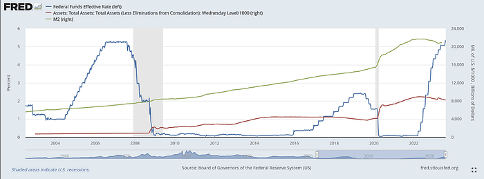 - The green line is the M2 monetary aggregate, effectively “money held by the public,” not just in checking accounts but also in money market mutual funds.