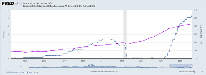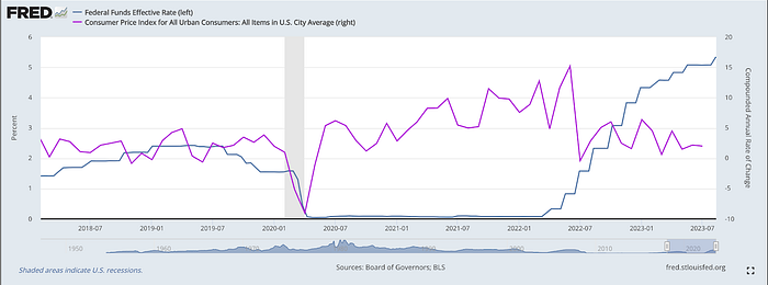 These happy circumstances have led some observers to congratulate Powell and the Fed on achieving a “soft landing”. But crediting the Fed is magical thinking. There is no way, under any theory or precedent, that rate hikes beginning in [March] 2022 could have knocked back inflation by July of the same year. Whatever its consequences down the road, the Fed’s policy tightening has been irrelevant to the inflation slowdown so far. [Bold added.]