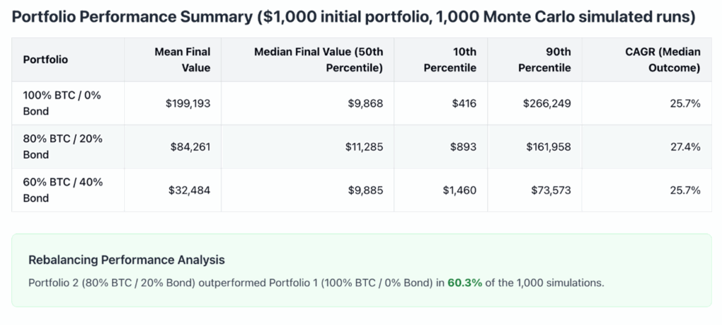 In contrast, the more conservative portfolio, which every month rebalances to maintain 80% allocation to Bitcoin and a 20% allocation to the safe bond, outperforms if we look at the median performance. Specifically, in the median outcome the 80/20 portfolio has a final value of $11,285, implying a long-run CAGR of 27.4%.