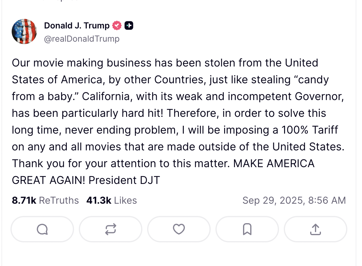 Calling the trade deficit a “national emergency” and justifying a schedule of large tariffs via this Act was always a stretch, but it has now reached absurdity: Nobody can possibly argue with a straight face that imports of foreign films constitutes an emergency.